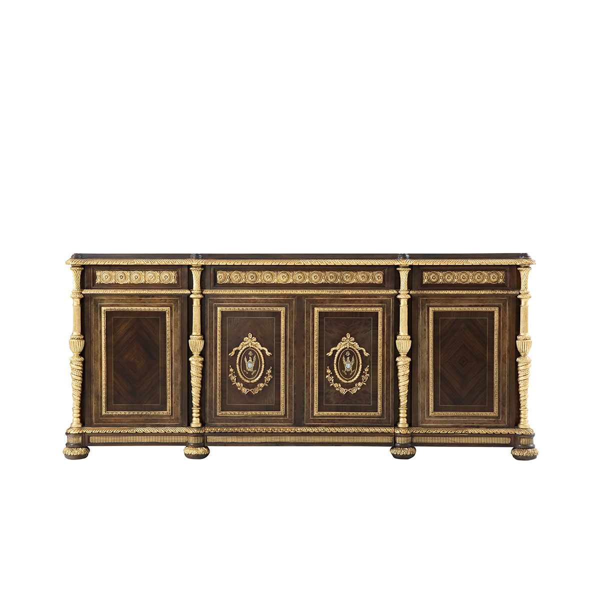 采用謝拉頓風(fēng)格經(jīng)典桌腿,上端配以常用的箍和腳輪,參考優(yōu)雅高貴的 Ionic Order(愛(ài)奧尼克式羅馬柱)雕刻,鑿刻出精致的手工雕刻細(xì)節(jié),以及輔以紋理清晰而有層次的木皮拼花,帶來(lái)溫莎堡皇廷般奢雅的辦公體驗(yàn)。