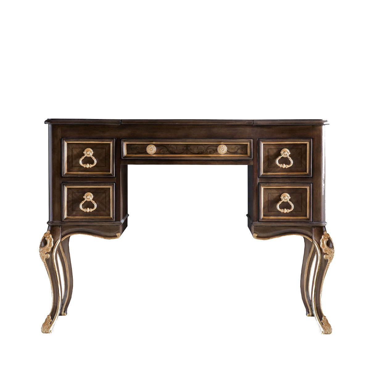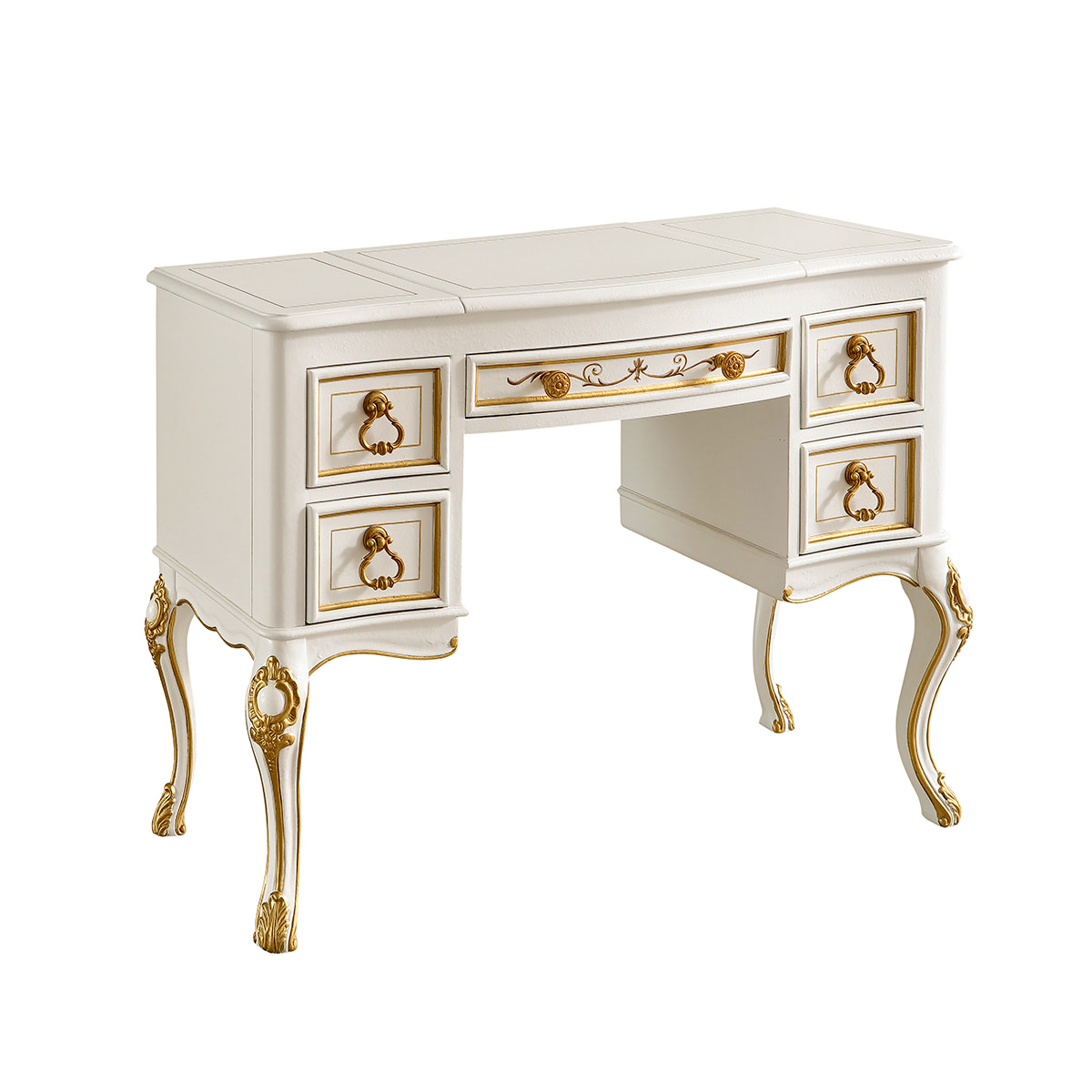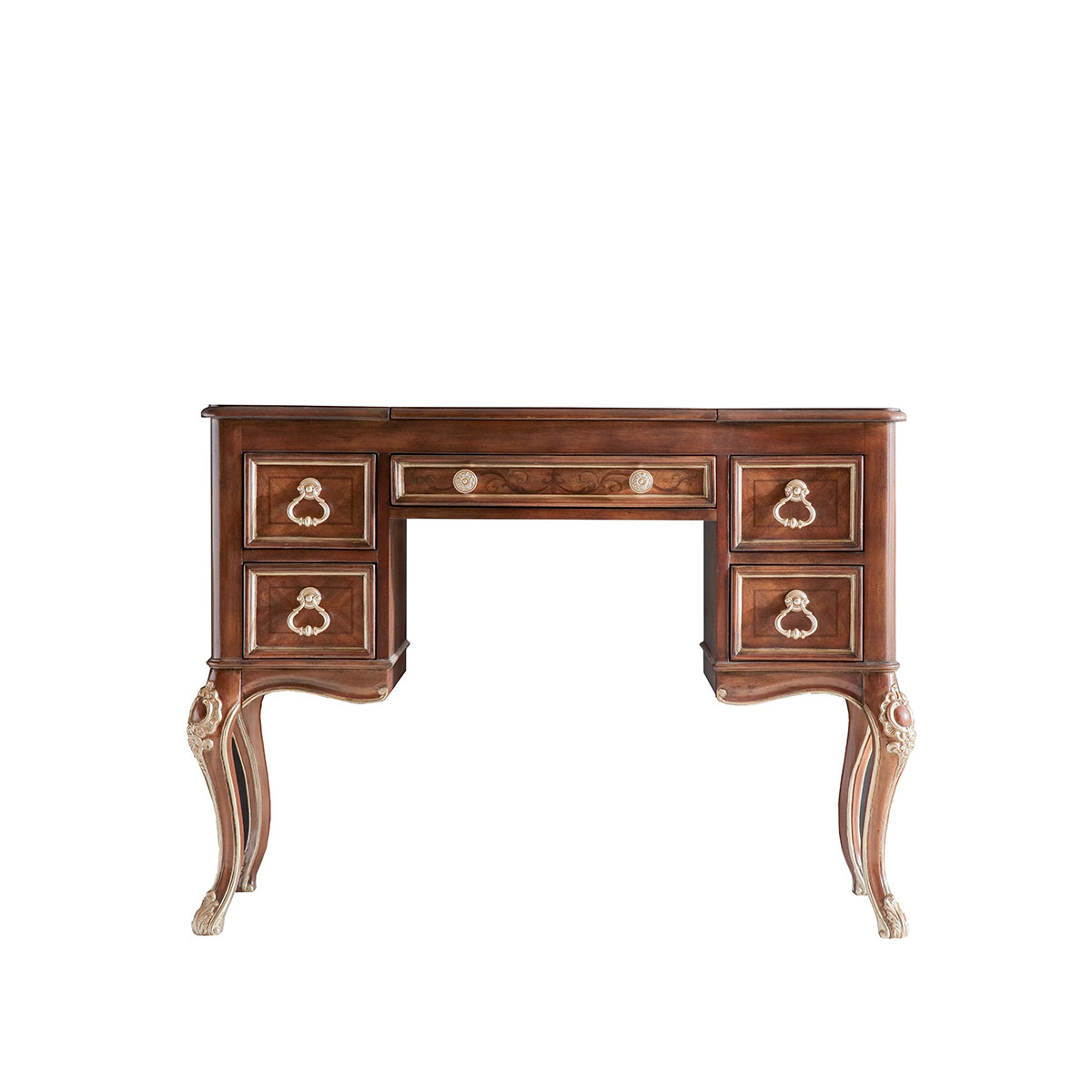 * 四個儲物抽斗,底部采用硬木實木滑軌.中間抽斗的設計可翻下斗面,用來放置鍵盤,抽斗內側有電線孔,抽斗兩邊裝有兩條三節消聲鐵滑軌,滑順耐用; * 中間面板可打開,里面有鏡子和絨布戒指格; * 腳底部裝有可調腳釘
