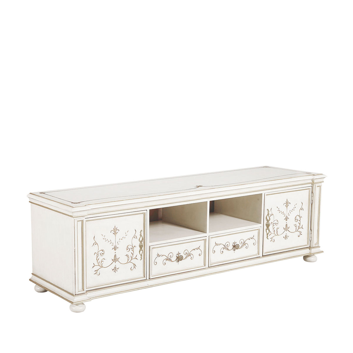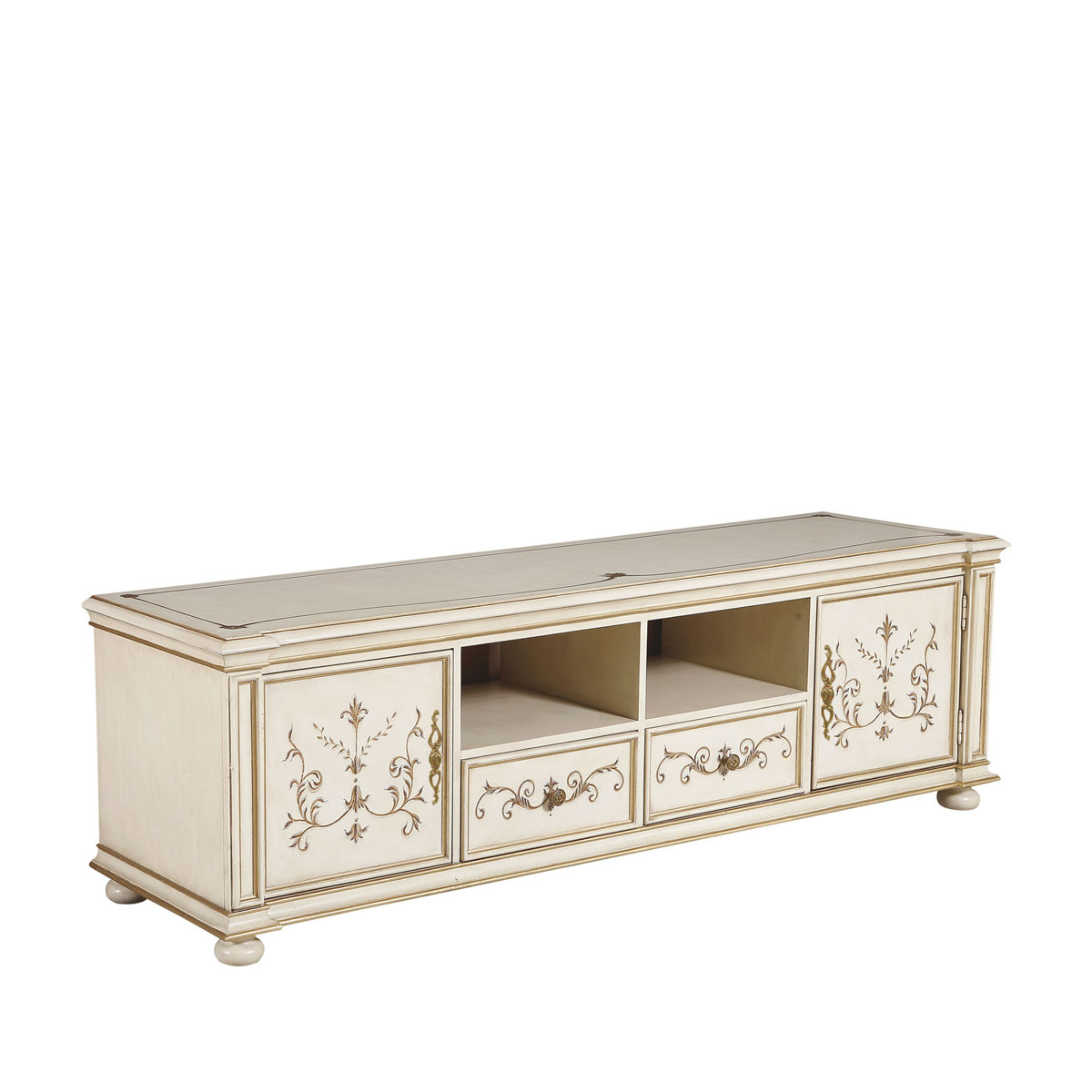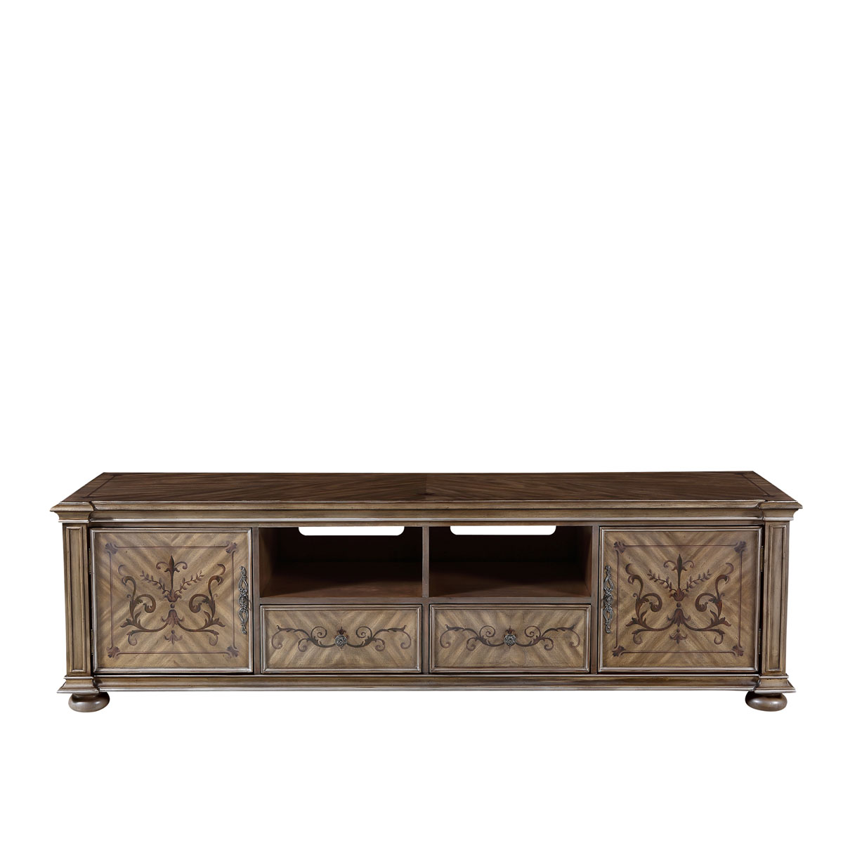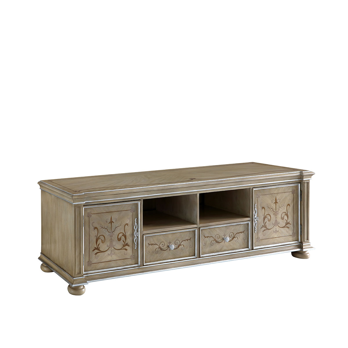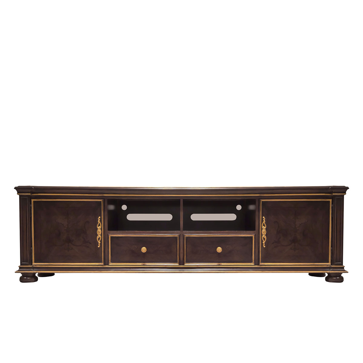 * 中間兩個儲物抽斗配有CD/DVD隔板,可CD/DVD更好的存放,其底部采用經典硬木實木滑軌設計; * 兩扇門內各有一塊可調層板;上部為開空設計,可在內放播放器等電子器材; * 腳底部裝有可調腳釘;