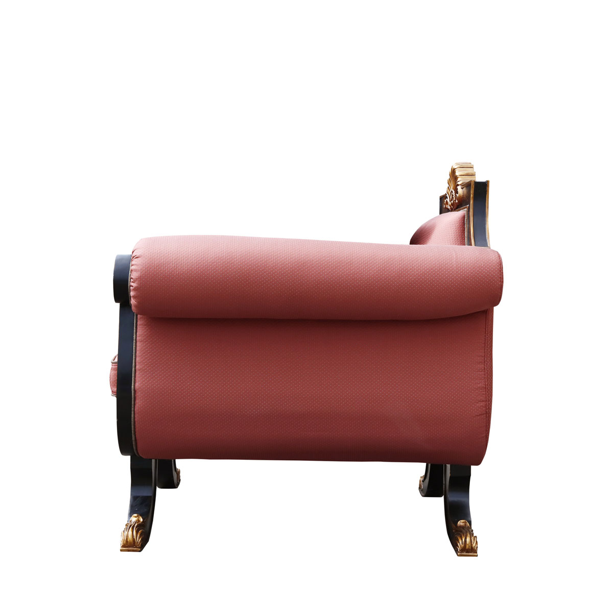 沙發(fā)采用五月花號(hào)輪船的造型,兩卷軸扶手向外翻轉(zhuǎn),纖細(xì)的四個(gè)彎腿支撐,粗中有細(xì),體現(xiàn)出航海的自由與勇敢,紅色的面料配黑色手繪的邊框,典型的中西文化合壁,典雅穩(wěn)重又倍顯多元文化的交匯融合。