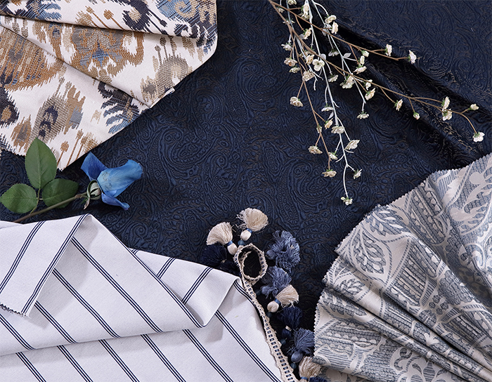 米白色調中加入適當比例的棕色,以天然的古樸抵抗歲月的痕跡;藍色刺繡提花栩栩如生,精致細膩中糅著典雅的矜持,承襲著悠久的傳統工藝,繡制華美藝術。